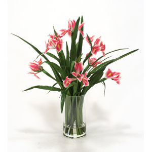Waterlook Japanese Iris Silk Floral with Blades in Cylinder Glass Vase by Distinctive Designs